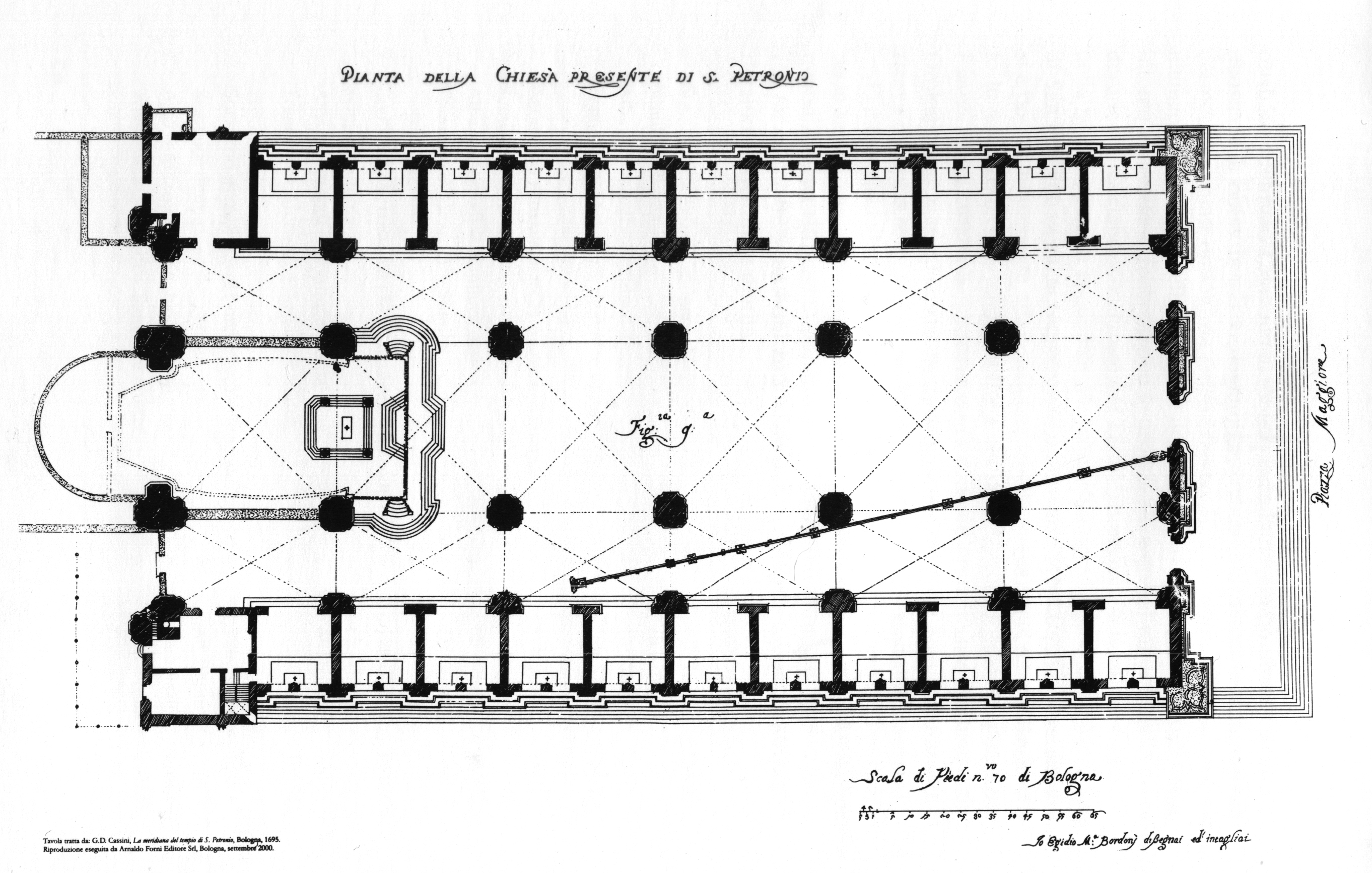 L'occasion se présente presque naturellement à lui, à peine quelques années plus tard, avec les grands travaux de démolition et d'agrandissement de l'église San Petronio, décidés par le Sénat de Bologne. L'église possède déjà une ligne méridienne, tracée en 1575 par le prêtre dominicain Ignazio Danti (1536-1586), mais elle décline de plus de 9° de l'axe méridien. Cassini propose d'en refaire une autre, pourvue d'un gnomon élevé à près de 27 m, s'étendant sur le parvis de la basilique sur une longueur de 67 m jusqu'au point marquant le solstice d'hiver, tout en réussissant à se faufiler au milieu de la colonnade dense de la nef. On pourrait ainsi relever la hauteur du Soleil en tout moment de l'année avec une précision jamais atteinte ! Le Sénat est réticent mais son mécène est puissant. Au jour du solstice d'été de l'année 1655, Cassini organise en grandes pompes, avec toute la solennité voulue, le tracé au sol du lieu occupé par l'image du Soleil lors de son passage au méridien. Tout ce que Bologne compte de notables est réuni. Parmi eux, on y remarque les figures de savants bolognais déjà reconnus tels le père jésuite Giovanni Riccioli (1598-1671) et son disciple, Francesco Grimaldi (1618-1663) qui se fera connaitre quelques années plus tard, en 1665, par sa découverte du phénomène de diffraction de la lumière (dans son Physicomathesis de lumine, coloribus, et iride, 1665). Dans cette mise en scène du début des travaux de tracé de la grande ligne méridienne, il y a du Galilée en Cassini.